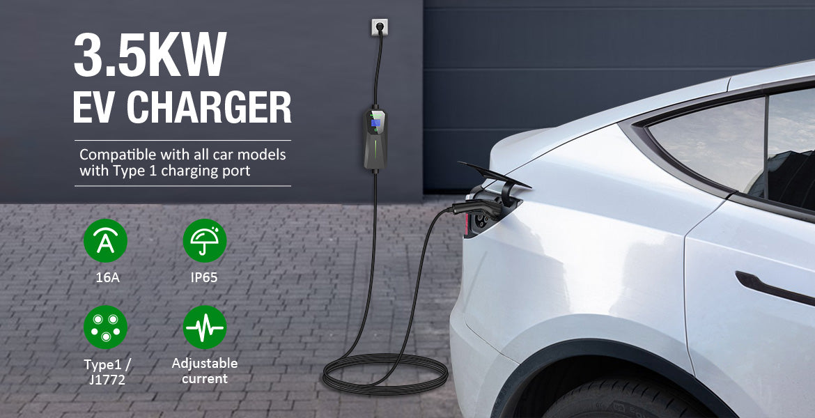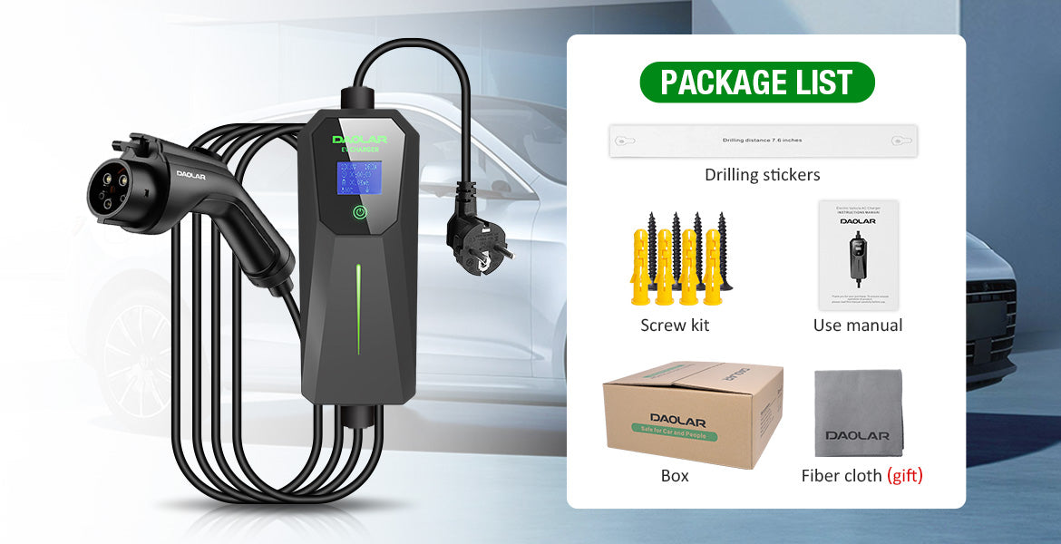 Mobilní nástěnná nabíječka Daolar typu 1 3,68 kW 16 A s ovladatelným digitálním displejem, 2pinový nabíjecí kabel Schuko na J1772 pro elektromobily a plug-in hybridy