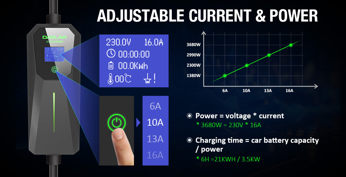 ✅ Nastavitelný proud: Podle potřeb nabíjení vašeho elektromobilu flexibilně upravte nabíjecí proud (6A/10A/13A/16A), aby byl proces nabíjení efektivnější a bezpečnější.