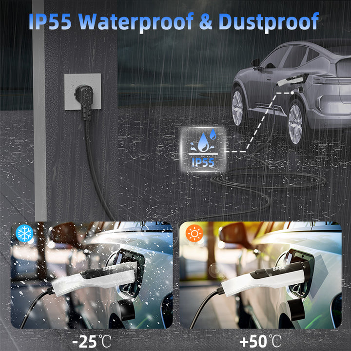 - IP55 veden- ja pölynkestävä: Kestävästä kuoresta valmistettu **IP55-luokiteltu mobiililaturi** kestää monenlaiset Euroopan sääolosuhteet. Toimii moitteettomasti -25℃–50℃ lämpötiloissa, luotettava kaikissa ilmastoissa.