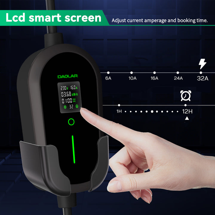 Cavo di ricarica per auto Daolar Mobile Mallbox da 7 KW, 3 pin CEE 32 A a tipo 2, caricabatterie per veicoli elettrici monofase da 32 A con ricarica programmata per modelli Y/3, ID.3/4/5, MG4, EX30, e-up, e-tron, Zoe, Q4, Gla ecc.