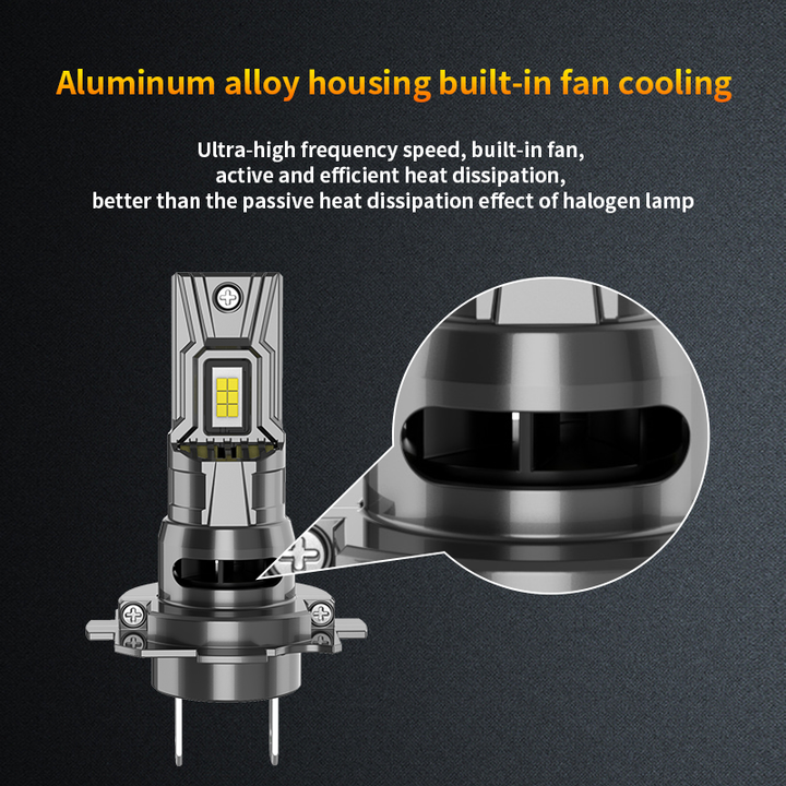 Sistema di Raffreddamento Attivo per una Durata Estesa: Dotato di una ventola integrata ad altissima velocità all’interno del corpo in lega di alluminio, questo sistema offre una dissipazione del calore attiva ed efficiente. Questo raffreddamento superiore supera la gestione passiva del calore delle lampade alogene, proteggendo i chip LED e prolungando la durata complessiva del prodotto.