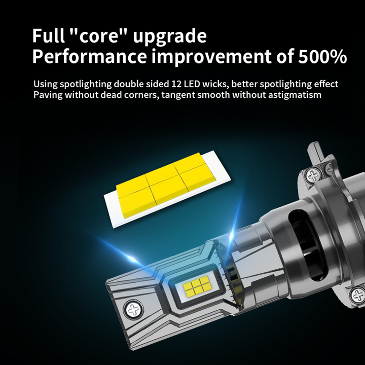 Luminosità Incrementata del 500% e Visione Notturna Superiore: Sperimenta un enorme miglioramento delle prestazioni con il nostro aggiornamento "full-core", che utilizza stoppini LED a doppia faccia da 12 LED. Questo offre un incremento del 500% della luminosità rispetto alle lampadine alogene standard, fornendo un effetto faro più concentrato e migliore per una guida più chiara e sicura senza angoli morti o astigmatismo.