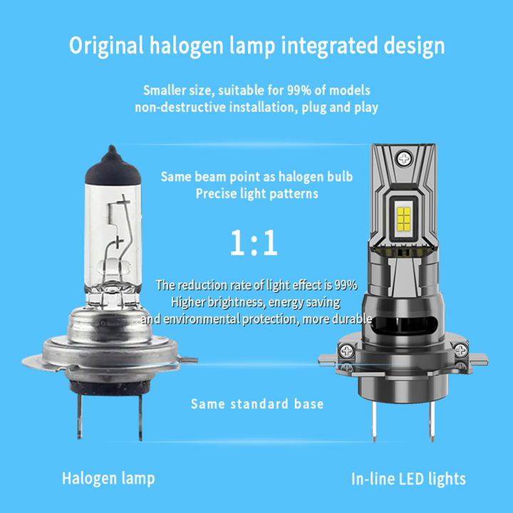 Design Integrato 1:1 con Alogena per un’Installazione Facile: Progettato per corrispondere perfettamente alle dimensioni e alla base standard della tua lampadina alogena originale (rapporto 1:1), garantendo un’installazione plug-and-play non distruttiva adatta a circa il 99% dei modelli di veicoli. Ottieni schemi luminosi precisi e una sostituzione senza problemi in pochi minuti.